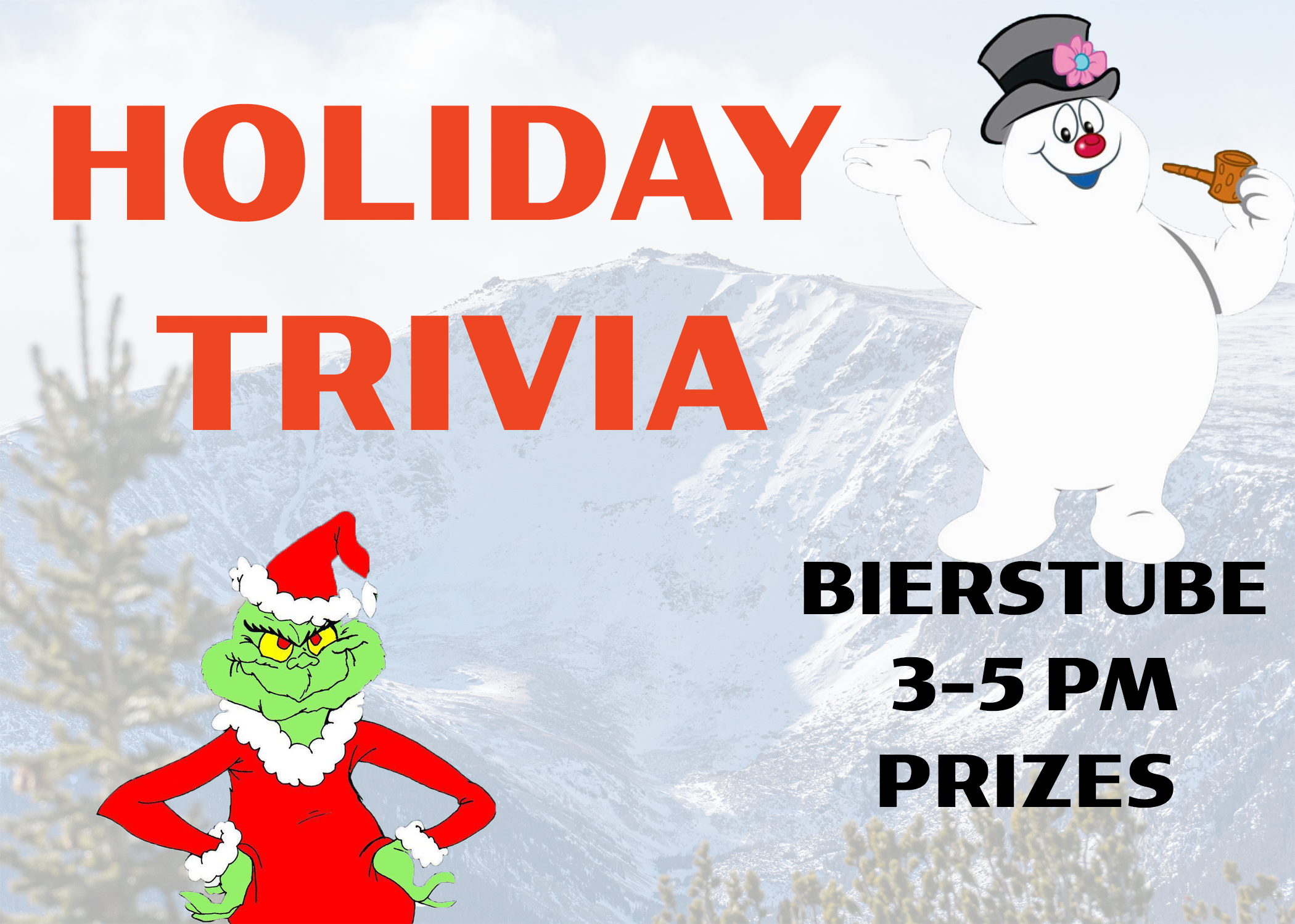 Time to get quizzical! Stop by the Bierstube after a day on the slopes to relax and unwind with some holiday trivia from 4-5:30 PM. Yes, there will be prizes!